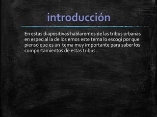 Este documento habla sobre la tribu urbana de los emos. Explica que un emo representa un estado de infelicidad o melancolía y que su comportamiento se caracteriza por estar triste, llorar sin razón y aislarse de los demás. También describe la apariencia estereotipada de los emos y algunas de sus prácticas como cortarse la piel. Finalmente, menciona algunas características de su personalidad como vivir en constante depresión.