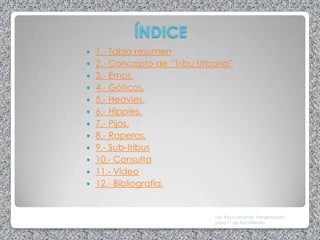 Este documento resume 7 tribus urbanas: emos, góticos, heavies, hippies, pijos, raperos y sub-tribus. Describe el origen, características e ideología de cada tribu, incluyendo detalles sobre su vestimenta, música e intereses. También incluye una tabla resumen comparando las tribus, y secciones sobre el concepto general de tribu urbana y una encuesta sobre tribus conocidas.
