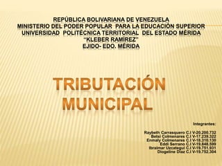 El documento presenta información sobre los impuestos municipales en Venezuela. Explica que los municipios tienen la potestad tributaria de crear, modificar o suprimir impuestos de acuerdo a la constitución y leyes. Luego describe varios impuestos como el impuesto sobre inmuebles urbanos, vehículos, espectáculos públicos, propaganda y actividades económicas. Finalmente, brinda detalles sobre requisitos de patentes e impuestos a actividades que operan en varios municipios.