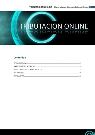 Este documento trata sobre la tributación online en el Perú. Explica los antecedentes históricos de la tributación en el Perú desde 1988 cuando se creó la Superintendencia Nacional de Administración Tributaria (SUNAT). También discute aspectos sociales y culturales relevantes como el contexto empresarial peruano dominado por microempresas y la importancia de la educación tributaria. Finalmente, describe el desarrollo de la tributación en el Perú influenciada por factores globales como la globalización y la tecnología, y los esfuerzos de armoniz