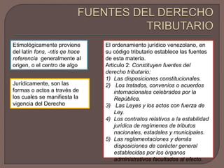 El documento resume las principales fuentes del derecho tributario en Venezuela según el código tributario, incluyendo la constitución, tratados internacionales, leyes, decretos, y reglamentaciones. Explica que los tributos son ingresos públicos obligatorios impuestos por el estado basados en la capacidad económica para obtener fondos para el gasto público. Además, distingue entre diferentes tipos de tributos como internos vs externos, directos vs indirectos, generales vs especiales, y progresivos vs regresivos. Finalmente, discute los efect