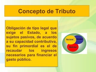 Los tributos son obligaciones legales que exige el Estado a los ciudadanos de acuerdo a su capacidad económica para financiar el gasto público. Los tributos se clasifican en impuestos, tasas y contribuciones, donde los impuestos son pagos sin contraprestación específica, las tasas se pagan por servicios públicos individualizados, y las contribuciones financian actividades estatales a cambio de beneficios.