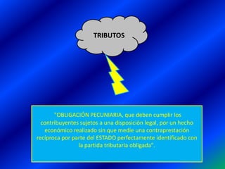 Este documento describe los diferentes tipos de tributos que existen, incluyendo impuestos, tasas y contribuciones especiales. Los impuestos se definen por hechos que muestran la capacidad contributiva y no implican una contraprestación del estado. Las tasas se generan por servicios individualizados prestados por el estado. Las contribuciones especiales se originan por beneficios de obras públicas cuyos fondos se destinan a esas obras.