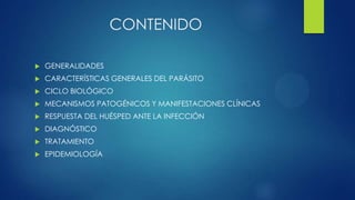 La tricocefalosis es una infección intestinal causada por el parásito Trichuris trichuria. El parásito tiene un ciclo de vida que implica la ingestión de huevos por un huésped, la maduración del parásito en el intestino grueso, y la eliminación de huevos en las heces. Los síntomas incluyen dolor abdominal, diarrea y prolapso rectal. El diagnóstico se basa en el análisis de heces y el tratamiento incluye medicamentos antiparasitarios como mebendazol o albendazol. La in