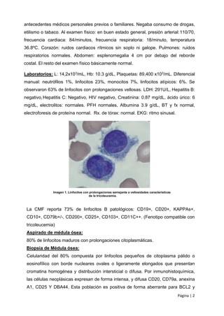 Se presenta el caso clínico de una paciente femenina de 52 años diagnosticada con tricoleucemia. Presentaba síntomas de 3 meses incluyendo astenia, disnea y dolor abdominal. Los exámenes mostraron bicitopenia, esplenomegalia y linfocitos con prolongaciones en la sangre y médula ósea. La citometría de flujo confirmó el diagnóstico de tricoleucemia. Se inició tratamiento con cladribina subcutánea.