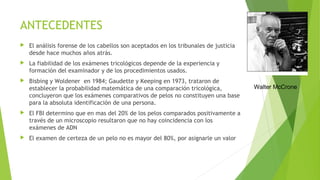 Este documento trata sobre tricología forense, que es el estudio de los pelos y cabellos con fines de identificación en investigaciones criminales. La tricología forense permite determinar características como el origen, sexo, edad, región corporal y si los pelos fueron arrancados o cayeron de forma natural. El análisis microscópico de las estructuras y pigmentación del pelo puede proporcionar pruebas importantes en casos criminales.