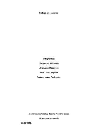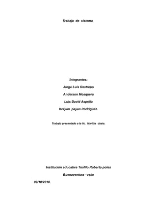 Este documento presenta un trabajo de sistema sobre enfermedades de transmisión sexual realizado por cuatro estudiantes de la Institución Educativa Teofilo Roberto Potes en Buenaventura, Valle del Cauca. El trabajo incluye una introducción, secciones sobre la gonorrea, VIH/SIDA, herpes, tricomoniasis, chancro y ladillas, y los resultados de una encuesta sobre tres enfermedades.