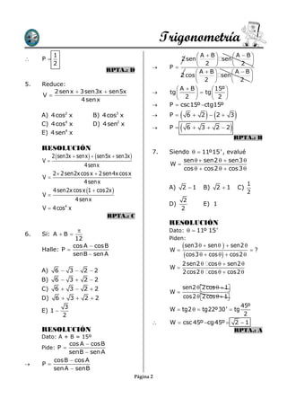 Este documento presenta varios problemas de trigonometría que involucran funciones trigonométricas como seno, coseno, tangente y cotangente. Los problemas incluyen simplificar expresiones, factorizar, hallar valores y reducir términos. Se proporcionan las respuestas a cada problema resuelto.
