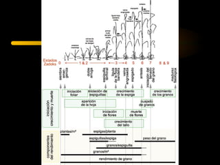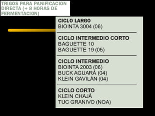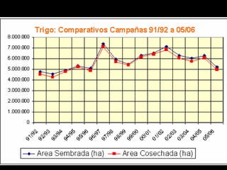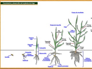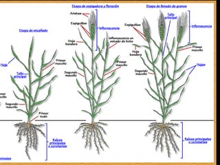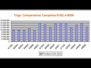 El documento proporciona información sobre el cultivo de trigo. Detalla las especies de trigo, sus características morfológicas como la inflorescencia y las flores, y provee estadísticas sobre la producción, exportación e importación mundial de trigo. Argentina es uno de los principales exportadores mundiales de trigo, representando alrededor del 9% de las exportaciones totales. Las principales provincias productoras de trigo en Argentina son Buenos Aires, Córdoba y Entre Ríos.
