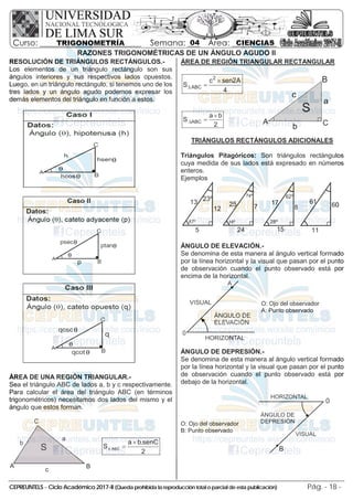 El documento trata sobre conceptos básicos de trigonometría como resolución de triángulos rectángulos, área de regiones triangulares y el cálculo de ángulos de elevación y depresión. Incluye ejemplos y ejercicios resueltos sobre estas temáticas.