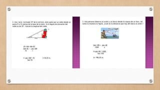 La trigonometría estudia las razones trigonométricas como seno, coseno y tangente y sus aplicaciones incluyen la triangulación para medir distancias entre objetos celestes y puntos geográficos y sistemas de navegación global. Define las funciones trigonométricas usando un triángulo rectángulo y representa gráficamente las funciones.
