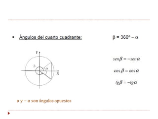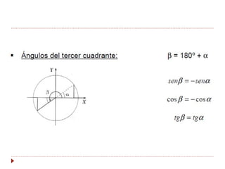 La trigonometría estudia las relaciones entre los lados y ángulos de los triángulos rectángulos. Esto permite calcular alturas y distancias inaccesibles. Las razones trigonométricas (seno, coseno y tangente) relacionan los catetos y la hipotenusa de un triángulo rectángulo con un ángulo dado. La circunferencia goniométrica muestra las razones trigonométricas para cualquier ángulo.