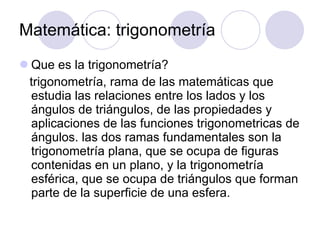 El documento proporciona una introducción a la trigonometría. Explica conceptos básicos como ángulos, funciones trigonométricas, identidades trigonométricas y su aplicación a triángulos. También cubre temas como el círculo trigonométrico, líneas y ángulos relacionados con círculos, y la representación analítica de figuras geométricas.