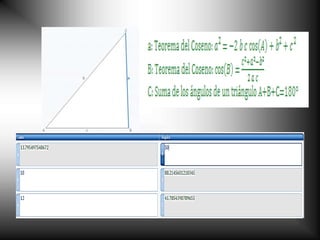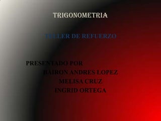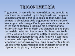 Este documento trata sobre trigonometría. Explica las razones trigonométricas (seno, coseno y tangente) y sus recíprocas (cosecante, secante y cotangente) usando triángulos rectángulos. También presenta ejemplos de cómo aplicar las funciones trigonométricas para resolver problemas como calcular la longitud de una escalera.