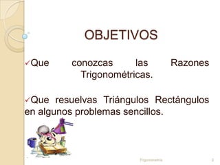 Este documento presenta una lección sobre las razones trigonométricas de un triángulo rectángulo. Explica las definiciones de seno, coseno y tangente para los ángulos agudos, y también las razones inversas. Proporciona ejemplos para ilustrar cómo calcular los lados desconocidos usando las razones trigonométricas. Además, describe los pasos para resolver triángulos rectángulos cuando se conocen ángulos y/o lados.
