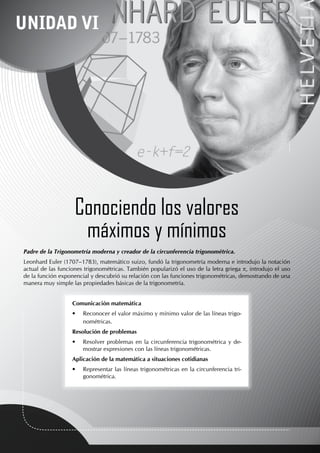 Este documento presenta información sobre la circunferencia trigonométrica y las líneas trigonométricas. Introduce conceptos como arcos orientados, circunferencia canónica y arcos en posición normal. Explica que la circunferencia trigonométrica tiene radio igual a la unidad y define las líneas trigonométricas seno, coseno y tangente para cualquier arco. Incluye ejemplos y problemas resueltos utilizando la circunferencia trigonométrica.