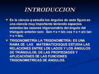 El documento trata sobre la trigonometría. Explica que la trigonometría estudia las relaciones entre los lados y ángulos de los triángulos y las funciones trigonométricas de los ángulos. Define las funciones seno, coseno y tangente y cómo calcularlas a partir de los catetos y la hipotenusa de un triángulo. Incluye ejemplos numéricos de cómo calcular estas funciones y determinar los valores de los ángulos.
