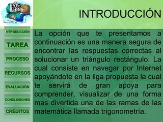 El documento presenta una lección sobre trigonometría que incluye 10 ejercicios para que los estudiantes resuelvan en parejas utilizando un recurso en línea. Los estudiantes deben entregar una lista de funciones trigonométricas utilizadas, los problemas resueltos con su procedimiento, y sugerir otro recurso sobre el tema. La lección concluye agradeciendo el recurso en línea por apoyar la comprensión de los estudiantes sobre trigonometría.