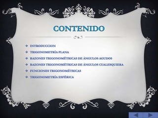 Este documento presenta una introducción a la trigonometría. Explica que la trigonometría estudia las relaciones entre los lados y ángulos de los triángulos y tiene aplicaciones en campos como la navegación, geodesia y astronomía. Se dividen las ramas de la trigonometría plana y esférica, describiendo las razones trigonométricas de ángulos agudos y cualesquiera, así como las funciones trigonométricas y su relación con los ángulos medidos en radianes.