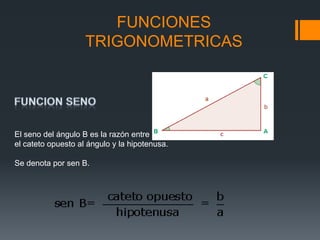 Este documento presenta información sobre trigonometría. Explica las funciones trigonométricas básicas como seno, coseno y tangente. También cubre las razones trigonométricas reciprocas y la resolución de problemas comunes usando el teorema del seno y del coseno. Incluye ejemplos numéricos para ilustrar los conceptos.