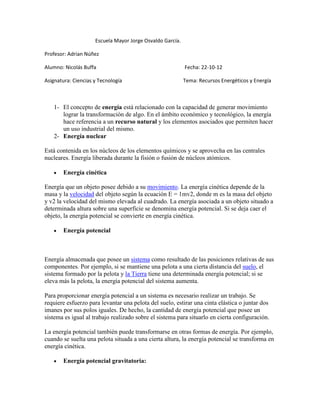 Este documento describe diferentes formas de energía renovables y no renovables, incluyendo energía nuclear, solar, eólica, geotérmica, hidráulica, mareomotriz y de las olas. Explica conceptos como energía potencial, cinética, mecánica y cómo se pueden transformar unas formas de energía en otras. También describe cómo se generan y aprovechan estas diferentes fuentes de energía para producir electricidad u otros usos.