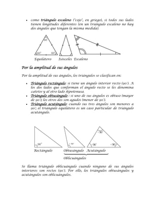 El documento describe los diferentes tipos de triángulos. Un triángulo se define como un polígono de tres lados y tres vértices. Los triángulos se pueden clasificar según la longitud de sus lados (equilátero, isósceles, escaleno) o según la medida de sus ángulos interiores (acutángulo, rectángulo, obtusángulo). Dentro de cada categoría, existen subtipos de triángulos como isósceles, escaleno o equilátero.