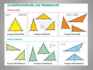 Este documento resume las propiedades de los triángulos, incluyendo su clasificación según los ángulos (triángulo rectángulo, obtusángulo, acutángulo), la suma de los ángulos interiores es 180 grados, y la suma de los ángulos exteriores es 360 grados. También describe cómo comprobar estas propiedades mediante el dibujo y corte de triángulos.