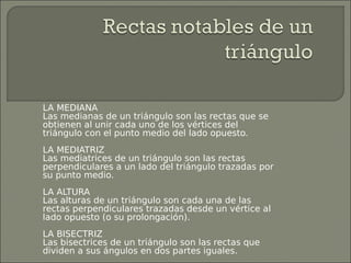 El documento describe las características geométricas de un triángulo, incluyendo las medianas, mediatrices, alturas y bisectrices. También define puntos notables de un triángulo como el baricentro, circuncentro, ortocentro e incentro, que son el punto de intersección de las medianas, mediatrices, alturas y bisectrices respectivamente.