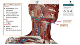El documento describe los diferentes triángulos del cuello, incluyendo sus límites, suelo y contenido. Los principales triángulos son el submandibular, milohioideo, submentoniano, carotideo, muscular, occipital y supraclavicular. Cada uno tiene límites definidos por los músculos y huesos circundantes, un suelo formado por otros músculos, y contiene estructuras importantes como arterias, venas y nervios.