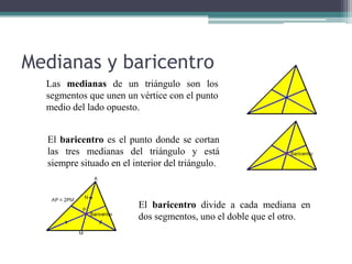 Este documento describe varios puntos y líneas notables de un triángulo. Explica que las medianas, mediatrices, alturas y bisectrices son segmentos que se trazan desde los vértices y lados de un triángulo. También describe que el baricentro, circuncentro, ortocentro e incentro son puntos donde se cortan tres de estas líneas, y que la recta de Euler pasa a través del baricentro, circuncentro y ortocentro.