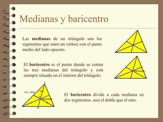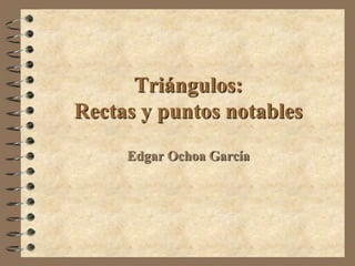 El documento describe varias líneas y puntos notables de un triángulo. Estos incluyen las medianas, mediatrices, alturas y bisectrices, así como sus puntos de intersección como el baricentro, circuncentro, ortocentro e incentro. También menciona la recta de Euler que pasa por el baricentro y el octocentro.