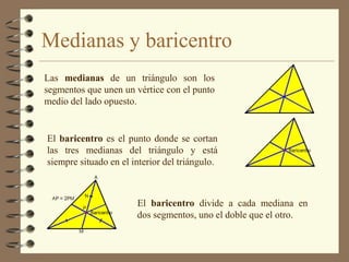 El documento describe varios puntos y líneas notables de un triángulo, incluyendo las medianas, mediatrices, alturas y bisectrices. Explica que el baricentro, circuncentro, ortocentro e incentro son los puntos donde se cortan esas líneas, y que dividen los lados y ángulos de maneras específicas. También introduce la recta de Euler, que pasa a través del baricentro, circuncentro y ortocentro.