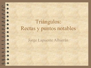 Este documento describe las diferentes rectas y puntos notables de un triángulo, incluyendo las medianas y el baricentro, las mediatrices y el circuncentro, las alturas y el ortocentro, las bisectrices y el incentro, y la recta de Euler. Explica que estas rectas y puntos se definen por las propiedades geométricas de los lados, ángulos y vértices de un triángulo.