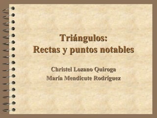 Este documento describe varios puntos y líneas notables de un triángulo, incluyendo las medianas, mediatrices, alturas, bisectrices y la recta de Euler. Explica que las medianas, bisectrices y alturas se cortan en el baricentro, incentro y ortocentro respectivamente, y que las mediatrices se cortan en el circuncentro.