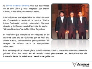 El Trío de Guitarras Domine se formó en 2003 e interpreta arreglos para trío de guitarra de música sacra universal realizados por Daniel Cabrio. Los integrantes tienen formación superior en conservatorios argentinos. Han realizado presentaciones en Argentina, Italia y han sido invitados a grabar programas en EEUU. Editaron su primer CD con obras de compositores como Bach, Haendel y Pachelbel.