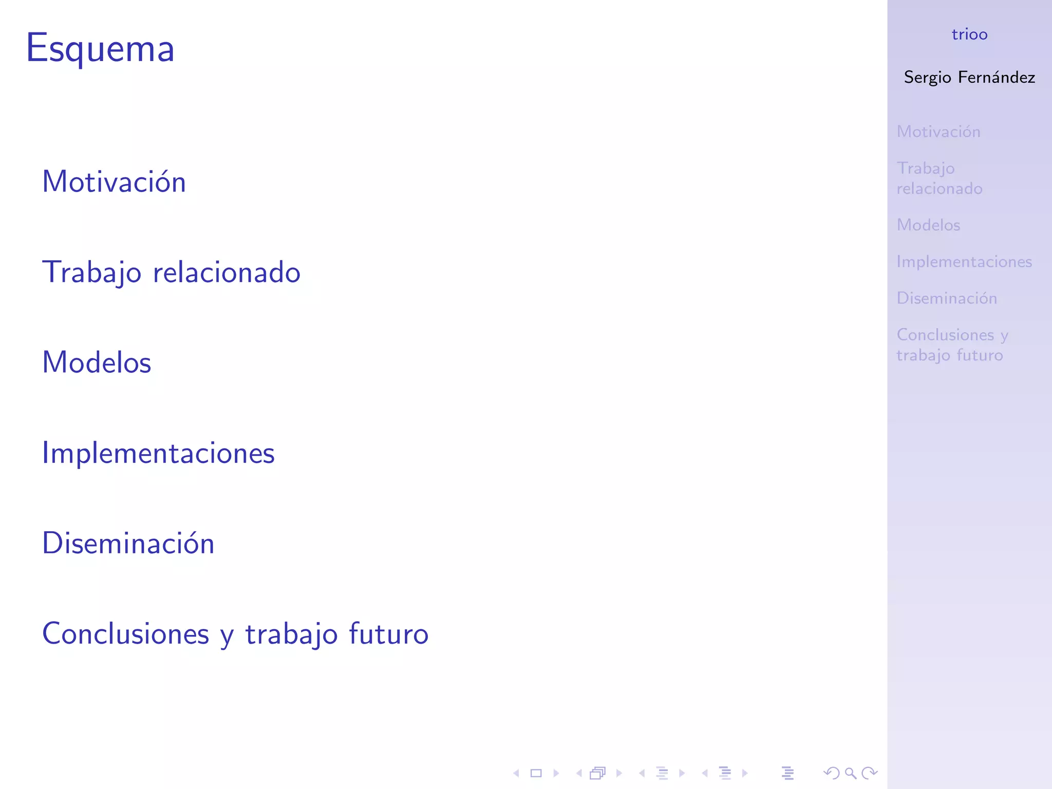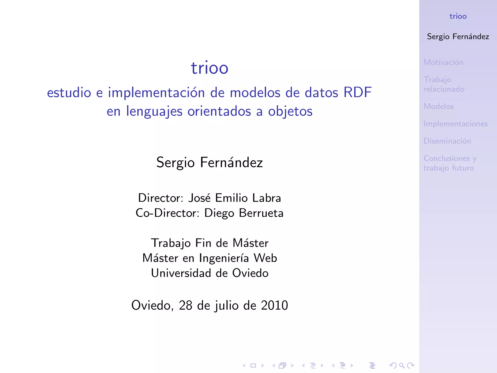 Este documento resume el trabajo de investigación de Sergio Fernández sobre la implementación de modelos de datos RDF en lenguajes orientados a objetos. El trabajo analiza el estado del arte, propone una metodología y presenta varias implementaciones para validar los resultados. El trabajo está relacionado con mapeos entre objetos y bases de datos, acceso a datos semánticos en la Web, y herramientas para almacenes tradicionales y RDF.