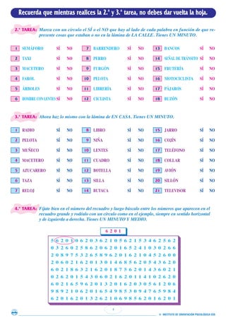 Este documento presenta una prueba de memoria y atención que consiste en varias tareas como marcar dibujos idénticos, identificar palabras que representan objetos en láminas, emparejar números en un recuadro, y completar frases. El examinador dará instrucciones detalladas para cada tarea y controlará el tiempo asignado a cada una.