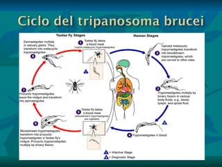 Los tripanosomas son parásitos protozoarios que viven en la sangre y tejidos de humanos y animales. Tienen un ciclo de vida que involucra dos huéspedes, insectos y mamíferos. Algunas especies importantes son Trypanosoma brucei, que causa la enfermedad del sueño en humanos en África, y Trypanosoma cruzi, que causa la enfermedad de Chagas en América.