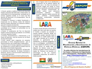 El Consejo Estadal de Planificación y Coordinación de Políticas Públicas del Estado Lara es el órgano rector de la planificación y coordinación de las políticas públicas del estado. Sus competencias incluyen aprobar y modificar el Plan de Desarrollo Estadal, coordinar los distintos niveles de gobierno, evaluar el gasto público y el cumplimiento del Plan de Desarrollo, y formular recomendaciones sobre los planes de desarrollo local.