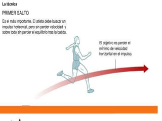 El triple salto es una prueba de atletismo que consiste en realizar tres saltos seguidos para cubrir la mayor distancia posible. Se origina a partir de pruebas atléticas griegas y se incorporó a los Juegos Olímpicos en 1896. Para realizarlo correctamente, el atleta debe correr, saltar a la pata coja en el primer salto, cambiar de pierna en el segundo y caer en el foso en el tercero, maximizando la distancia recorrida de forma legal según las reglas.