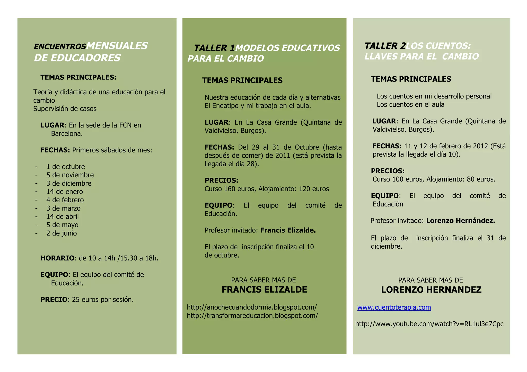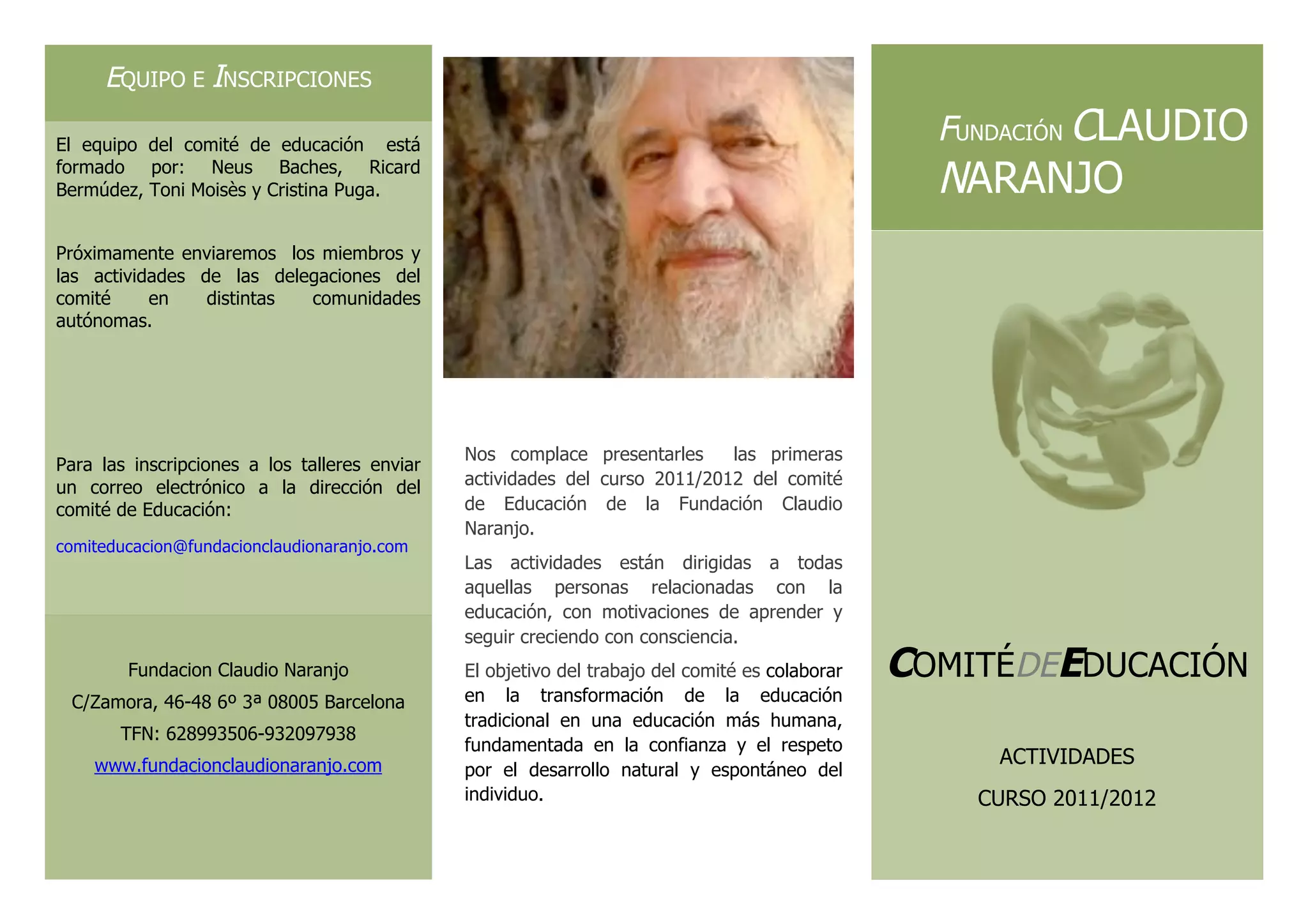 El documento presenta las actividades del comité de educación de la Fundación Claudio Naranjo para el curso 2011/2012, incluyendo encuentros mensuales de educadores, dos talleres y los detalles sobre los equipos, fechas, lugares y precios de cada actividad.