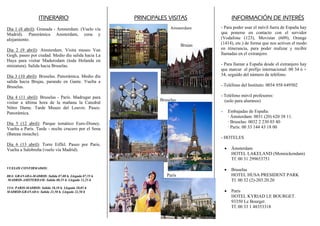 El viaje de estudios de 4oESO del IES Nazarí incluye visitas a Ámsterdam, Bruselas y París entre el 8 y el 13 de abril. El itinerario detalla las visitas principales en cada ciudad, como el museo Van Gogh en Ámsterdam, paseos por las ciudades y un crucero por el río Sena en París. Además, proporciona información útil como los teléfonos de emergencia y los detalles de los hoteles donde se alojarán en cada ciudad.