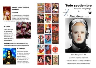 La filmografía de Pedro Almodóvar abarca desde 1980 hasta 2019 e incluye películas como Pepi, Luci, Bom y otras chicas del montón, ¿Qué he hecho yo para merecer esto?, Mujeres al borde de un ataque de nervios, Todo sobre mi madre, Volver y Dolor y gloria. Almodóvar se ha inspirado en artistas como los pintores Costus y en películas como Los ojos sin rostro y Psicosis. Además, ha utilizado estilos como el kitsch, el camp y el pastiche en sus películas de