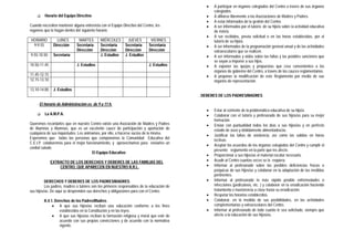 Este documento presenta el equipo educativo y directivo de un centro escolar para el curso 2010/2011. Incluye la lista de maestros y profesores con sus asignaturas, el horario escolar, normas sobre entradas y salidas, y los derechos y deberes de los padres y madres según el reglamento interno del centro.