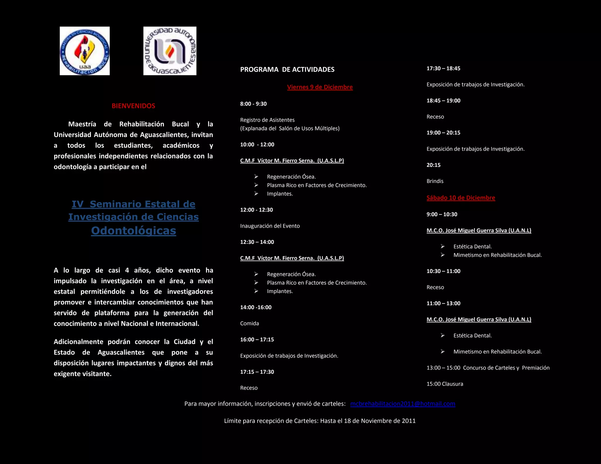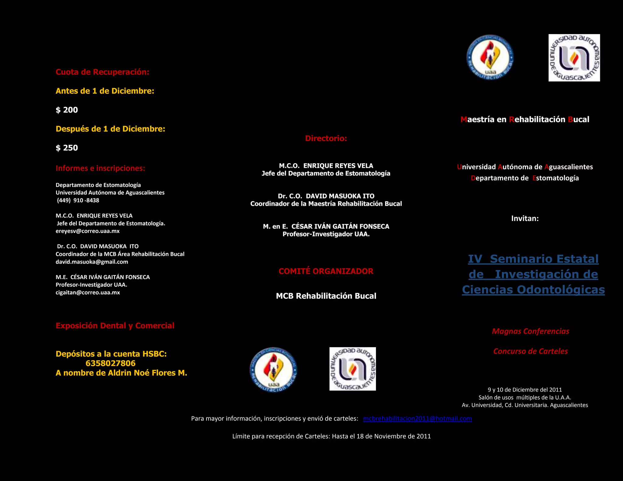 Este documento proporciona información sobre las cuotas y fechas límite para una Maestría en Rehabilitación Bucal. Antes del 1 de diciembre la cuota es de $200 pesos mexicanos y después del 1 de diciembre la cuota aumenta a $250 pesos mexicanos. También incluye detalles sobre el IV Seminario Estatal de Investigación de Ciencias Odontológicas que se llevará a cabo los días 9 y 10 de diciembre, incluyendo la agenda, ponentes y actividades.