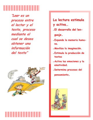 Este documento describe los beneficios de la lectura personal y cómo se aplica en la escuela. La lectura mejora la ortografía y estimula la imaginación y el desarrollo del lenguaje. Los estudiantes pueden seleccionar lecturas que les interesen y dedicar 15 minutos diarios a leer de manera recreativa.