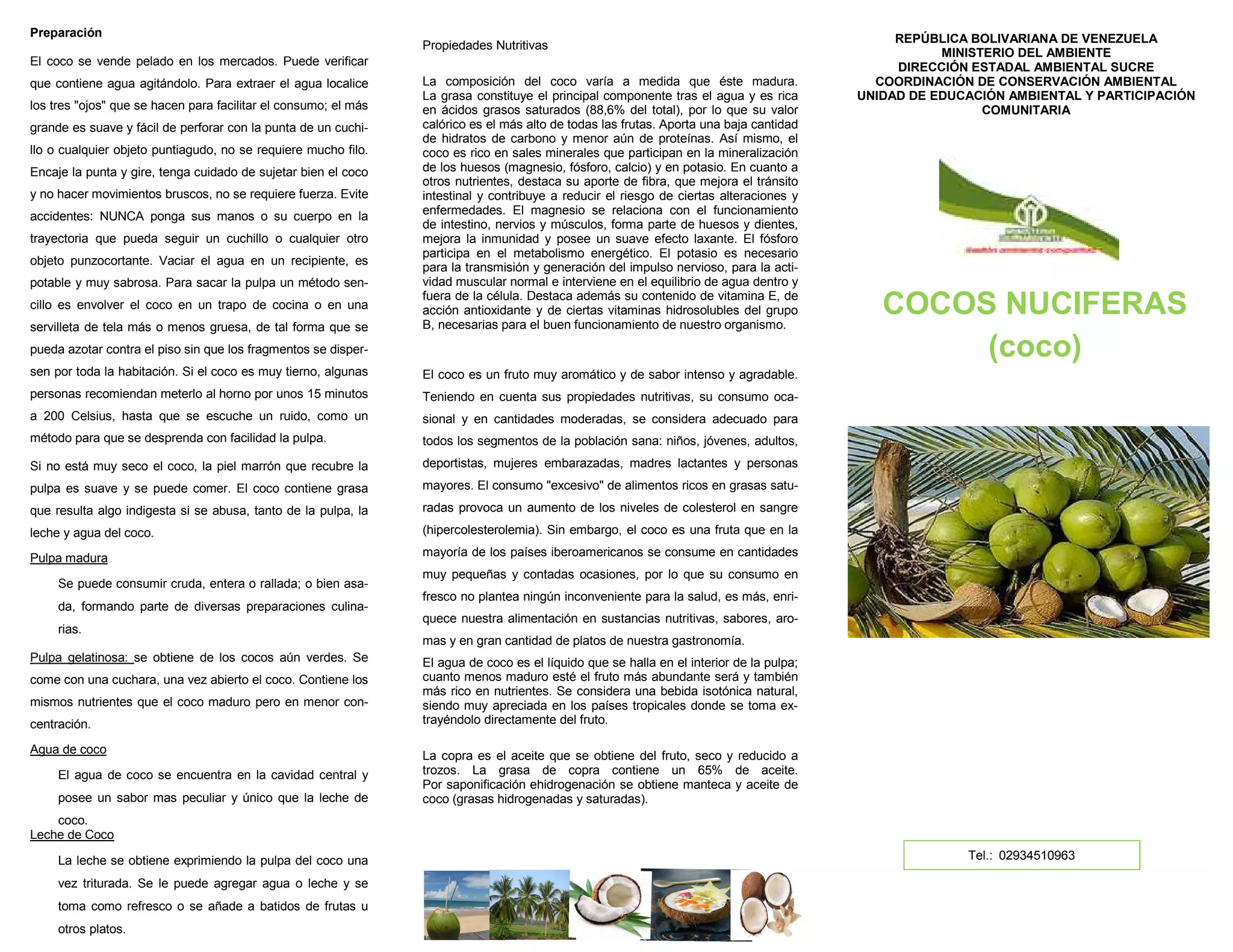 El documento describe las propiedades nutritivas y usos del coco. El coco contiene principalmente agua y grasa rica en ácidos grasos saturados. Además, proporciona minerales como magnesio, fósforo y calcio. Se puede consumir la pulpa, agua y leche de coco. La copra es el aceite obtenido del coco seco y se usa para producir manteca y aceite de coco.