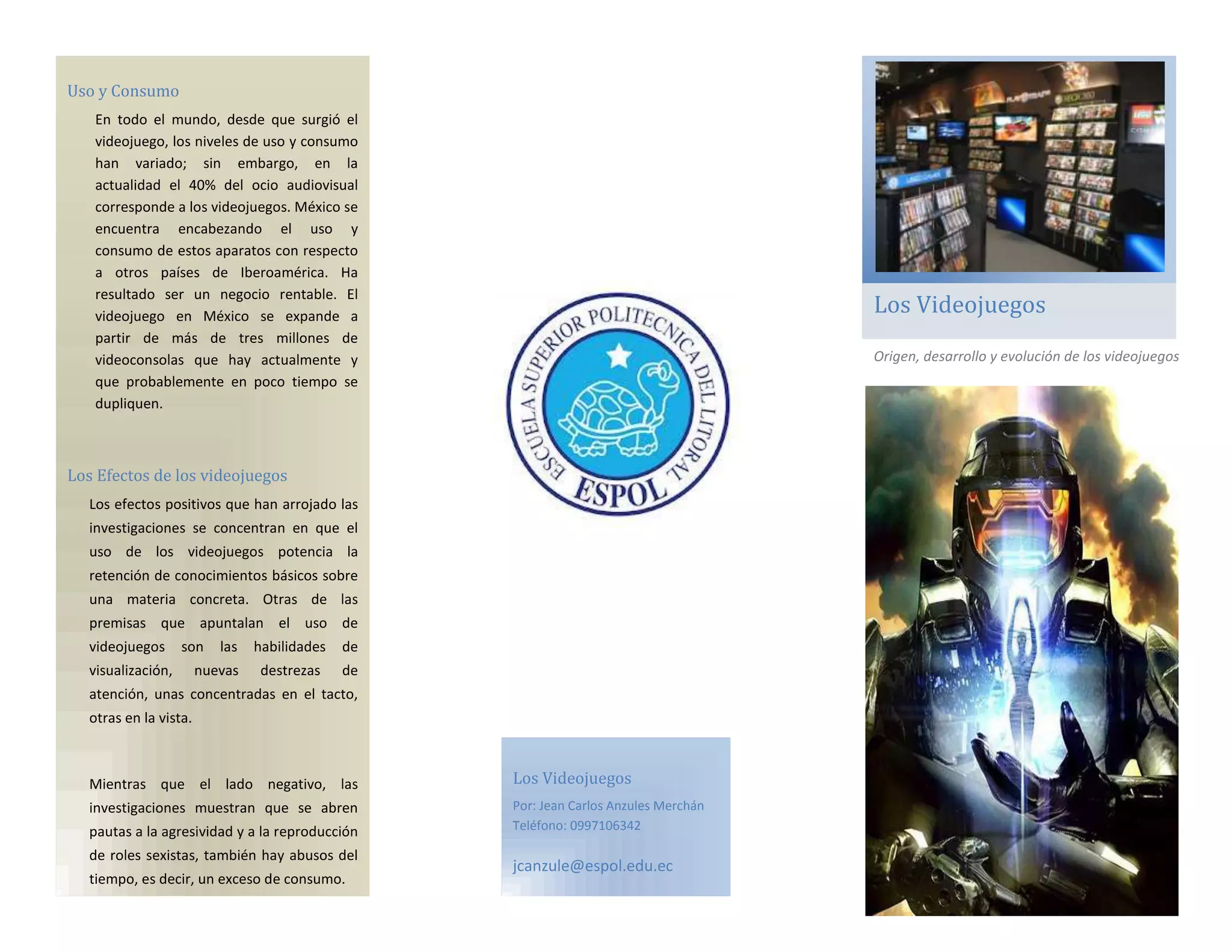 El documento discute el uso y consumo de videojuegos a nivel mundial y en México específicamente. Explica que actualmente el 40% del entretenimiento audiovisual corresponde a videojuegos y que México encabeza su uso en América Latina, con más de 3 millones de consolas. También resume los efectos positivos y negativos que han encontrado las investigaciones sobre los videojuegos.