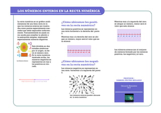 El documento explica cómo ubicar números enteros en la recta numérica. Indica que la recta numérica es una línea donde los números enteros se representan como puntos separados uniformemente, con los números positivos a la derecha de cero y los negativos a la izquierda. Cuanto más lejos de cero esté un número, mayor o menor será su valor para los positivos y negativos respectivamente.