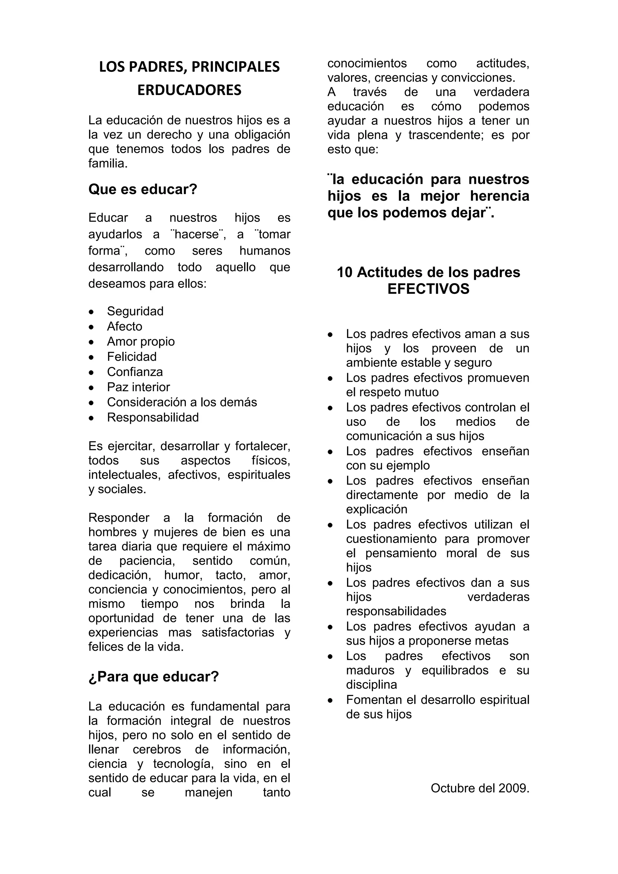 Este documento describe la importancia de la educación de los hijos por parte de los padres. Explica que la educación implica ayudar a los hijos a desarrollarse de manera integral física, intelectual, emocional, espiritual y socialmente. También menciona que la educación debe enfocarse no solo en la adquisición de conocimientos sino también en enseñar valores y actitudes para que los hijos puedan llevar una vida plena. Finalmente, enumera 10 actitudes clave de padres efectivos como amar e inculcar respeto en los hij